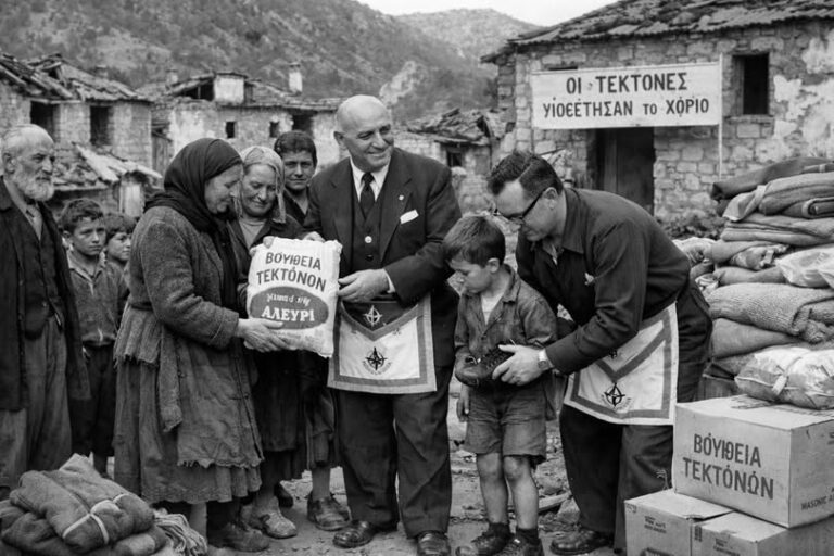 “Μόλις απομακρυνθεί κάποιος από τήν Αθήνα καί βρεθεί στήν ύπαιθρο αντιλαμβάνεται καί το μέγεθος τών λεγόμενων καταστροφών από τούς Γερμανούς τούς Ιταλούς καί τούς κουμουνιστάς αλλά καί το σπουδαίον έργον πού επιτελεί το υπό τήν προεδρείαν τής Α.Μ τού βασιλέως ίδρυμα “Πρόνοια συμμοριοπλήκτων”, το οποίο τμήμα είναι “οι Φίλοι τού Χωριού”. Η έκπληξις καί η χαρά τών κατοίκων τού χωριού Καλονέρι Κοζάνης, ήτο κάτι το τόσο συγκινητικό καί τόσο αυθόρμητο, ώστε είναι αδύνατον να περιγράφει επαρκώς. Δεδομένου μάλιστα ότι υπάρχουν δύο χωριά υπό το αυτό όνομα, οι κάτοικοι ετέλουν υπό παντελή άγνοια τής μεταβάσεώς μας, τα δε από το Τεκτονικό ίδρυμα αποσταλώντα τηλεγραφήματα επεδίδατο είς τόν πρόεδρον τής κοινότητος τού συνωνύμου χωριού. Τοιουτοτρόπως κατήλθε, τρόπον τινά, ουρανοκατέβατη είς το χωρίον ακριβώς τήν ημέρα τής μεγάλης εθνικής μας εορτής τής 28ης Οκτωβρίου. Το δικό μας χωριό Καλονέρι ευρίσκεται βορειοδυτικά τής Κοζάνης πρός το Αργος Ορεστικόν καί απέχει από τήν Κοζάνην περίπου 3 ώρες με αυτοκίνητο είναι σχεδόν εντελώς κατεστραμμένον. Μετά τήν άφιξιν είς το χωριό τού Αδελφού Λάσκαρη καί τού Αδελφού Θεοχάρη ως εκπροσώπων τού Τεκτονικού ιδρύματος καί τής εκπροσώπου τών φίλων τού χωριού, δεσποινίδος Ασπασίας Βουρνά, ύστερα από περιπλάνηση τριών ωρών μέσα από φαράγγια χαράδρες καί ποτάμια μάς υπεδέχθησαν οι κάτοικοι με τόν πρόεδρον τής κοινότητος καί τών δημοδιδασκάλων είς τήν πρό τής εκκλησίας καί τού σχολείου πλατείαν ο εκπρόσωπος τών φίλων τού χωριού δι΄ολίγων εξείρε τήν σημασίαν τού υπό τούτων αναληφθέντος έργου, τονίσας ιδιαιτέρως το έργον τής ιδικής μας αποστολής. Μετα ταύτα ο αδελφός Θεοχάρης παρέδωσε τήν σημαία τής κοινότητος είς τόν πρόεδρον, δώρον τής Ελληνικής Στοάς «Κίμων» υπ΄αριθ. 53 έν Ανατολής Κύπρου καί κατέθεσε στέφανον δάφνης είς μνήμην τών πεσόντων διά καταλλείλω προσφωνήσεως. Τέλος ομίλησεν ο Αδελφός Λάσκαρης συστήσας είς τούς κατοίκους να αφοσιωθούν είς τήν γήν αφηγηθείς τόν μύθον τού Ανταίου”.